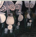 The people of Melanesia remain among the most traditional in the Pacific Islands. Many beliefs and art works, part of their cultures prior to Western contact, continue to this day. Diverse and complex forms using a variety of materials all combined in one piece characterize Melanesian art. Extraordinary masks and sculptures and architecture, which incorporate carved and painted decorations, are common art forms. One definition of a culture’s resilence and durability is it’s ability to adapt to change. These contemporary paintings from Papua New Guinea attest to that concept!